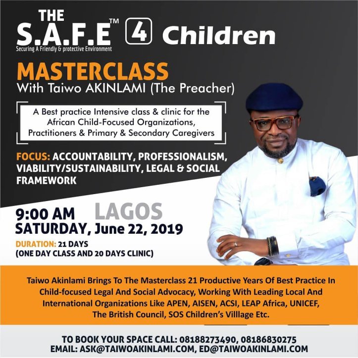 I am set for another S.A.F.E™ Masterclass…The last edition was very well attended. The class was in fact over subscribed.There is more to working with our precious children both as secondary and secondary caregivers than we are used to these days…So much opportunities wrapped in so much distractions…Yet there are tested strategies to help our precious children press pass the distractions and make the best of the opportunities of the 21st Century…As a legal practitioner, I have since 1999 worked within the Social Development space, promoting law as an instrument of Social Change, securing consistently the confidence of individuals and leading local and international bodies like UNICEF, British Council, SOS Children’s Village, APEN, AISEN, just to mention a few…My personal field work as a pioneer service/solution provider in the area of Legal Enlightenment and Social Development (LEAD) through Social Empowerment Advocacy (SEA) and consistent, fruitful and active interactions with organisations, who are unrepentantly committed to strong Corporate Governance, best, ethical and professional practices and due process reveal to me that there are ways things work. It is also very clear to me that until we work things the way they work, nothing works…I have come to know that in all things, HOW is superior to WHAT and WHERE…Knowing WHAT to do does not guarantee that we will get it done and so is knowing WHERE we are going does not guarantee we will get there except we embrace what I call the SCIENCE OF HOW…In the S.A.F.E™ Masterclass, holding in Lagos and Abuja(one day in class and 21 days of meaningful post-class activities), I will be dwelling on what I call the SCIENCE OF HOW or HOW OF THINGS, sharing NEW, DISTINCT, PROFOUND, RESEARCH-BASED, TESTED, EASILY-APPLICABLE AFRICAN-SENSITIVE and GLOBALLY RELEVANT thoughts on HOW to make the best of your Social Development Projects, particularly as they relate to Securing A FRIENDLY and PROTECTIVE Environment™ for the precious African child.Please note that you can hold me to EVERY OF THE ADJECTIVES used above to describe the contents of the MASTERCLASS with MONEY-BACK UNDERTAKING as the unforgivable sanctions for failure to meet any of them…The details are on the flyer and registration is on…I invite you to please register today and together by the POWER of STANDARDS we can create and operate the SCIENCE OF HOW in the BEST INTEREST OF THE PRECIOUS AFRICAN CHILD.See you in class and accept my highest regards,