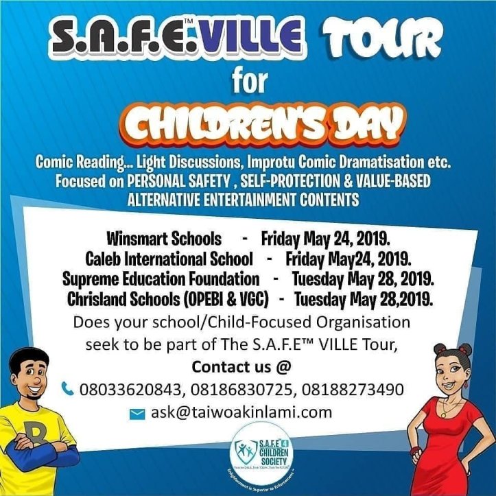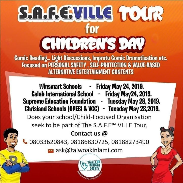 It is in the spirit of the foregoing that we celebrate this year’s Children’s Day with the precious Nigerian children with the launch of our S.A.F.E™VILLE TOUR. It is an all year round affair, which focuses on Comic Reading, Light but VALUE-BASED conversations, Impromptu Comic Drimatization by the precious participating children. It is hosted by schools any other Child-Focused or Child-Interested institutions/organisation. It is for children from age 8 to 18 in small group of between 15 and 45(maximum).
