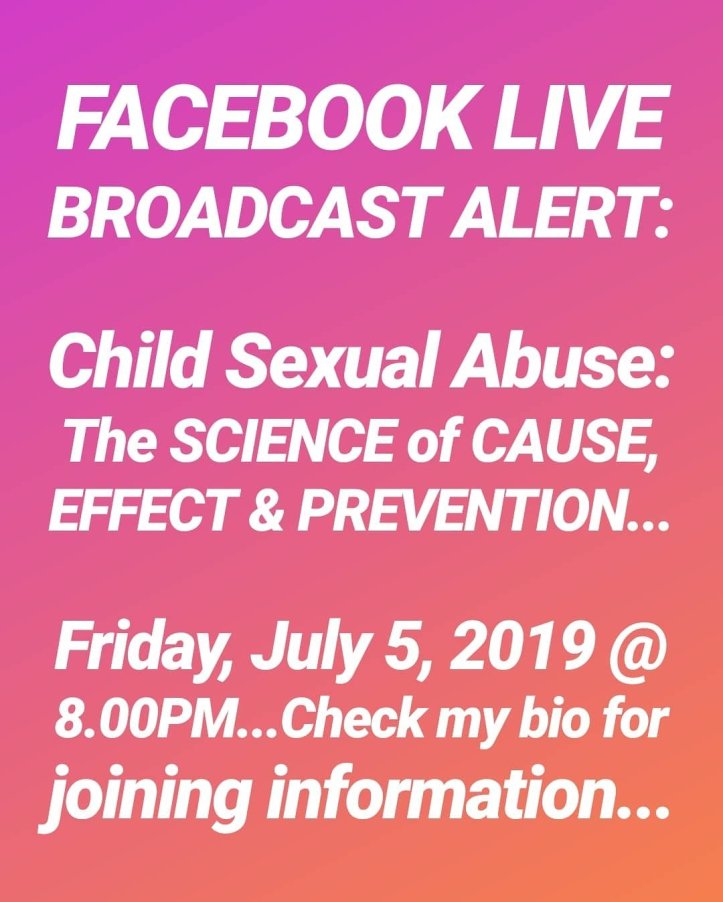 As an expert in prevention, (which is superior to cure), I will be sharing on my weekly Facebook broadcast at 8.00PM on Friday, July 5, 2019: ‘Child Sexual Abuse: The SCIENCE of CAUSE, EFFECT and PREVENTION…’