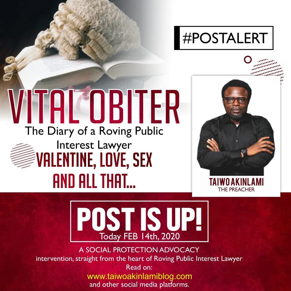 With this in mind, please allow me to conclude this discussion on Valentine, Love and All That. Still taking about love, I will like to say that the relationship that leads to a healthy marriage where sex is expected to be practiced as of right normally starts with acquaintanceship, then friendship. From there to deep affection and then marriage and then sex.