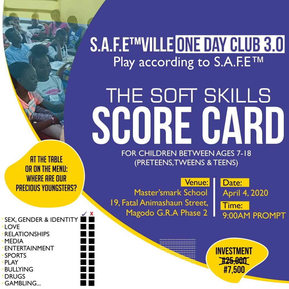 On Saturday April 4, 2020 at our S.A.F.E™VILLE ONE DAY CLUB, working with my team, we will be working with your precious youngsters to consider and enrich the Soft Skills Scorecard.