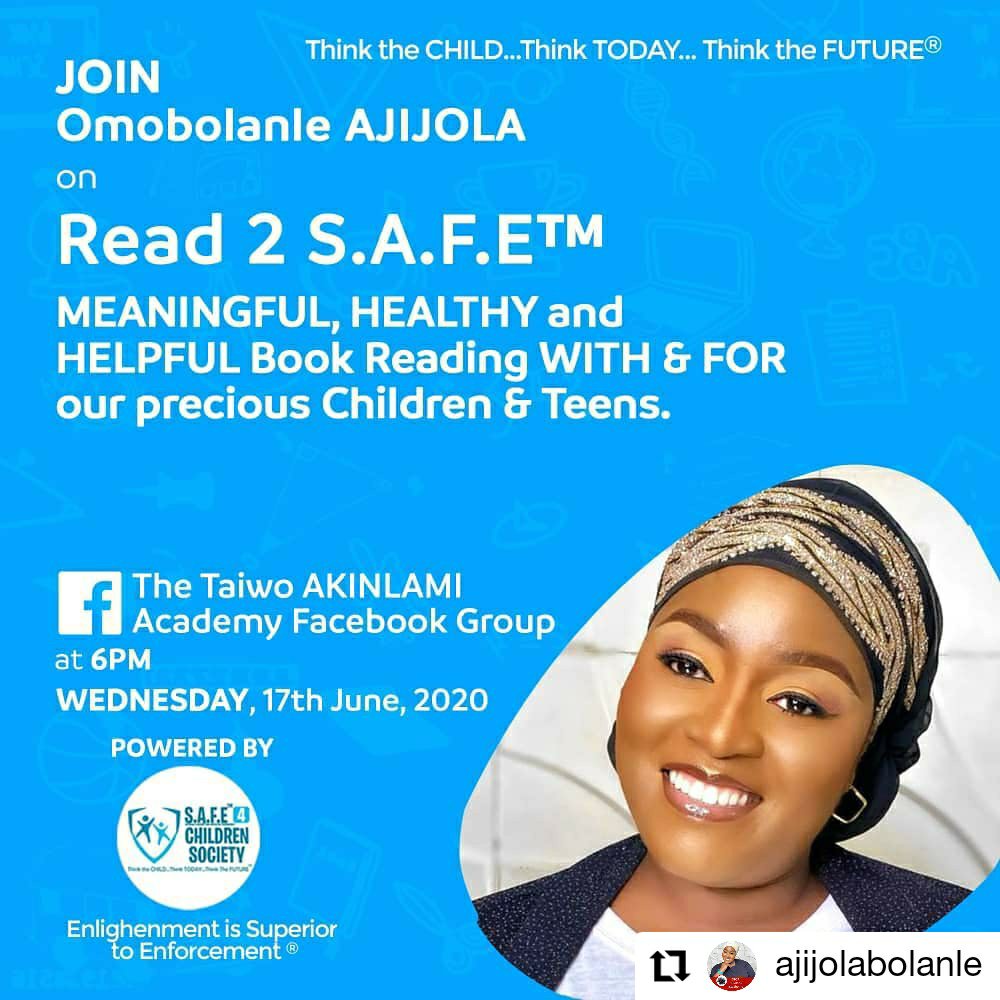 N.B. Please join us with your precious children on our Taiwo AKINLAMI Academy Facebook Group for Read 2 S.A.F.E® today at 6.00PM.