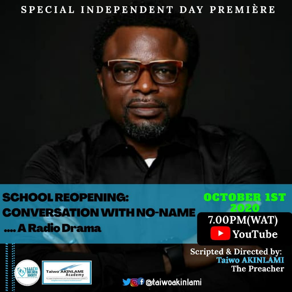Our Radio Drama, School Resumption: Conversation With No-Name premièred yesterday on YouTube Channel today here http://bit.ly/TaiwoAkinlamiYouTube to celebrate Nigeria’s Independent.
