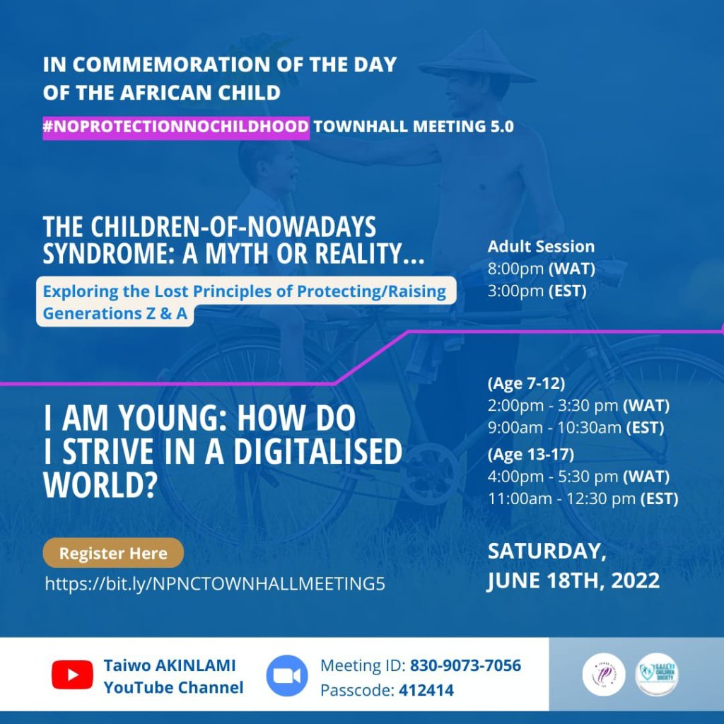 That is why in commemoration of the 2022 the Day of the African Child, we will be hosting our precious children and members of our S.A.F.E® for ME Children’s Parliament for the first time at the #NOPROTECTIONNOCHILDHOOD Town Hall Meeting and our precious children cannot miss out on this as it holds on Saturday, June 18, 2022 as follows: