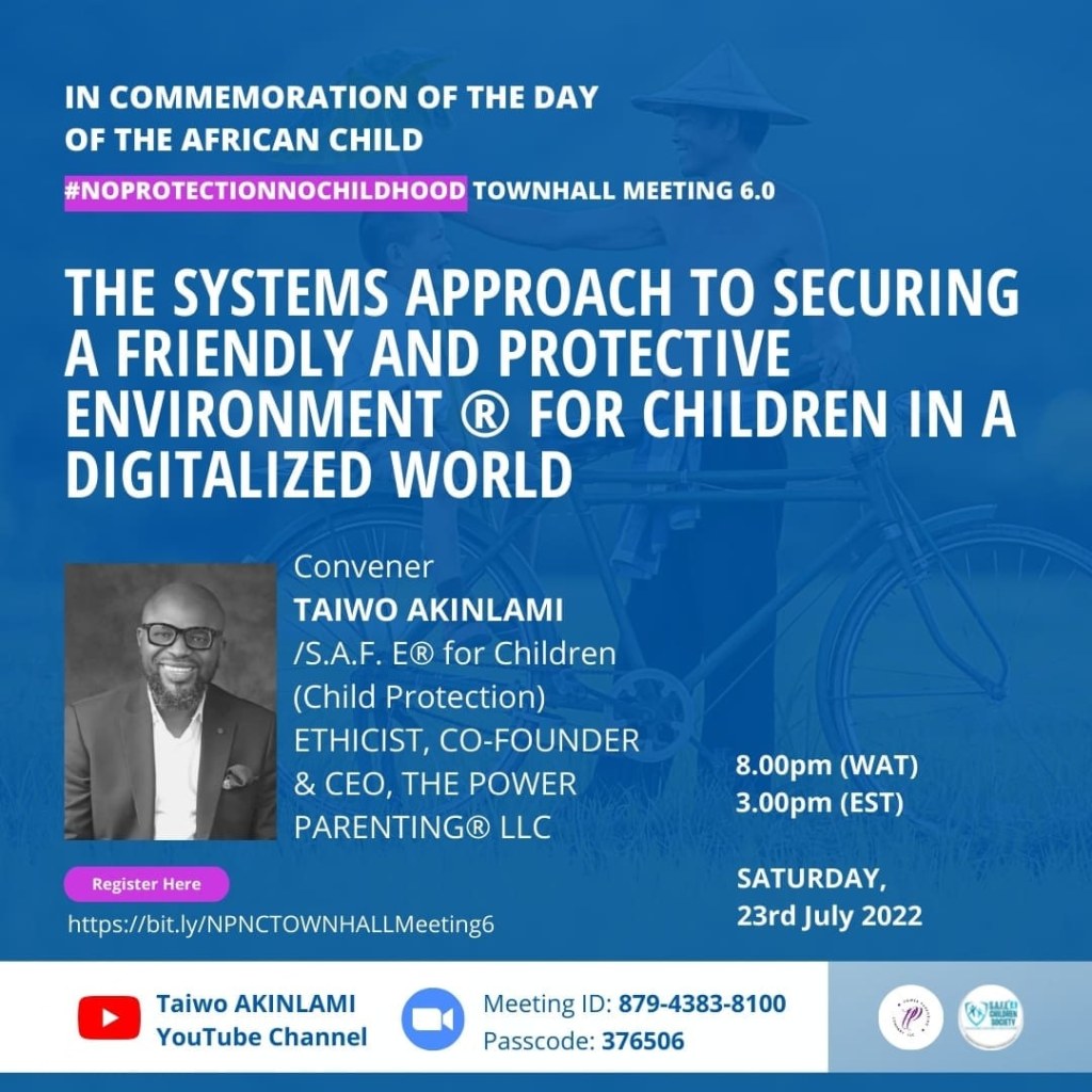 The #NOPROTECTIONNOCHILDHOOD Town Hall Meeting 6.0 is scheduled to hold on Saturday, July 23rd 2022 as follows: