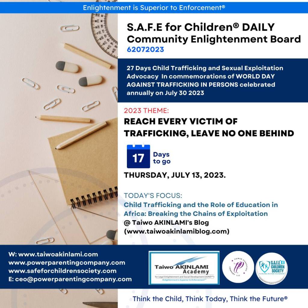 Education is a powerful catalyst in breaking the chains of exploitation caused by child trafficking in Africa. By prioritizing education, we empower children with the knowledge, skills, and resilience they need to protect themselves, pursue their dreams, and build a brighter future. Let us unite our efforts, advocate for increased investments in education, and work tirelessly to create a continent where every child is free from the clutches of trafficking and has the opportunity to thrive.