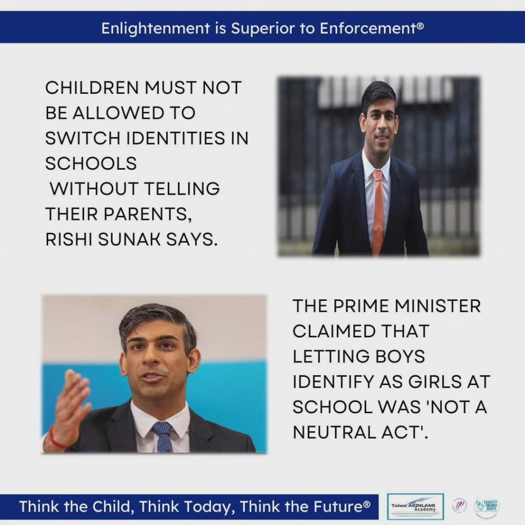 Children must not be allowed to switch identities in schools without telling their parents, Rishi Sunak says