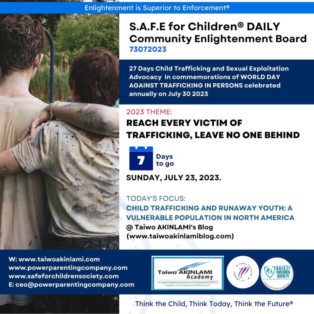 Child trafficking and runaway youth are not just statistics; they are innocent lives in jeopardy. As responsible members of North American society, we must come together to protect our future generation. Through advocacy, education, and coordinated efforts, we can create a safer, more compassionate environment that nurtures and safeguards every child’s right to a secure and fulfilling life. Let us stand united against this menace, leaving no child behind.